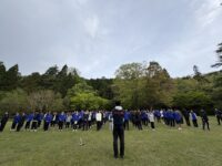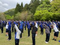 おはようございます。2日目の朝を迎えました。少し肌寒いですが、雨もあがり、芝生広場にて朝の集会を行いました。体の体操と頭の体操で、寝起きの体を起こしました!