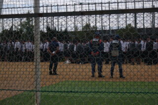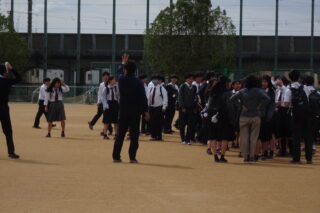 中間考査の最終日に、江井島消防署より消防隊員の方にお越しいただき避難訓練を行いました。