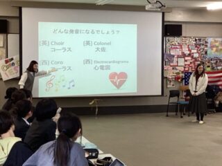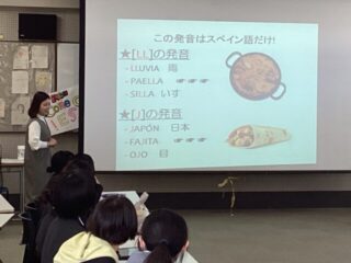 12月18日(木)、神戸市外国語大学から岸田早織先生、留学生のAlexandraさんを迎え、第2回スペイン語特別講座を実施しました。7月に行った第1回講座ではスペインの歴史や社会風俗、慣習などを中心に学びましたが、第2回では、語学分野をメインに受講しました。まず、スペイン語の特徴や発音、動詞の変化などについて、音声を意識して発声練習。みなさん、巻き舌発音がお気に入りのようでした。発音が日本語に近いこともあって、最後にはモデル文を使って自己紹介ができるようになりました。母語話者数が6億人を超えると言われるスペイン語ですが、料理の名前くらいしか浮かばない生徒も多く、大きな刺激を受けたようです。語学は一朝一夕に習得はできませんが、新しい文化に触れ、知らないことを受け入れることで、世界を見る目は広がり、他人の立場を推し測り、よりよいコミュニケーションにつなげていくことができます。遠い世界に想いを馳せながら、一歩一歩レベルアップしていきましょう。