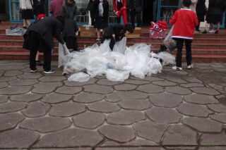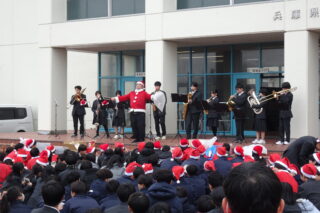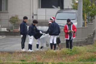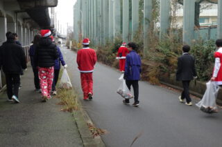 吹奏楽部のクリスマスソングの演奏のあと、参加者は、サンタクロースの衣装を身に着けたりして、日ごろお世話になっている通学路の清掃に向かいました。1時間弱の清掃でしたが、紙くずや空き缶といったごみを集め、通学路を少しきれいにして終えました。