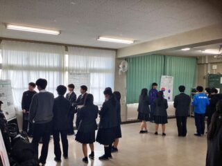 当日の発表会では、作成したポスターの前で5分間の発表を行い、その後、質疑応答を行いました。発表は一人で行い、聞いている生徒も積極的に質問して活発な発表会になりました。