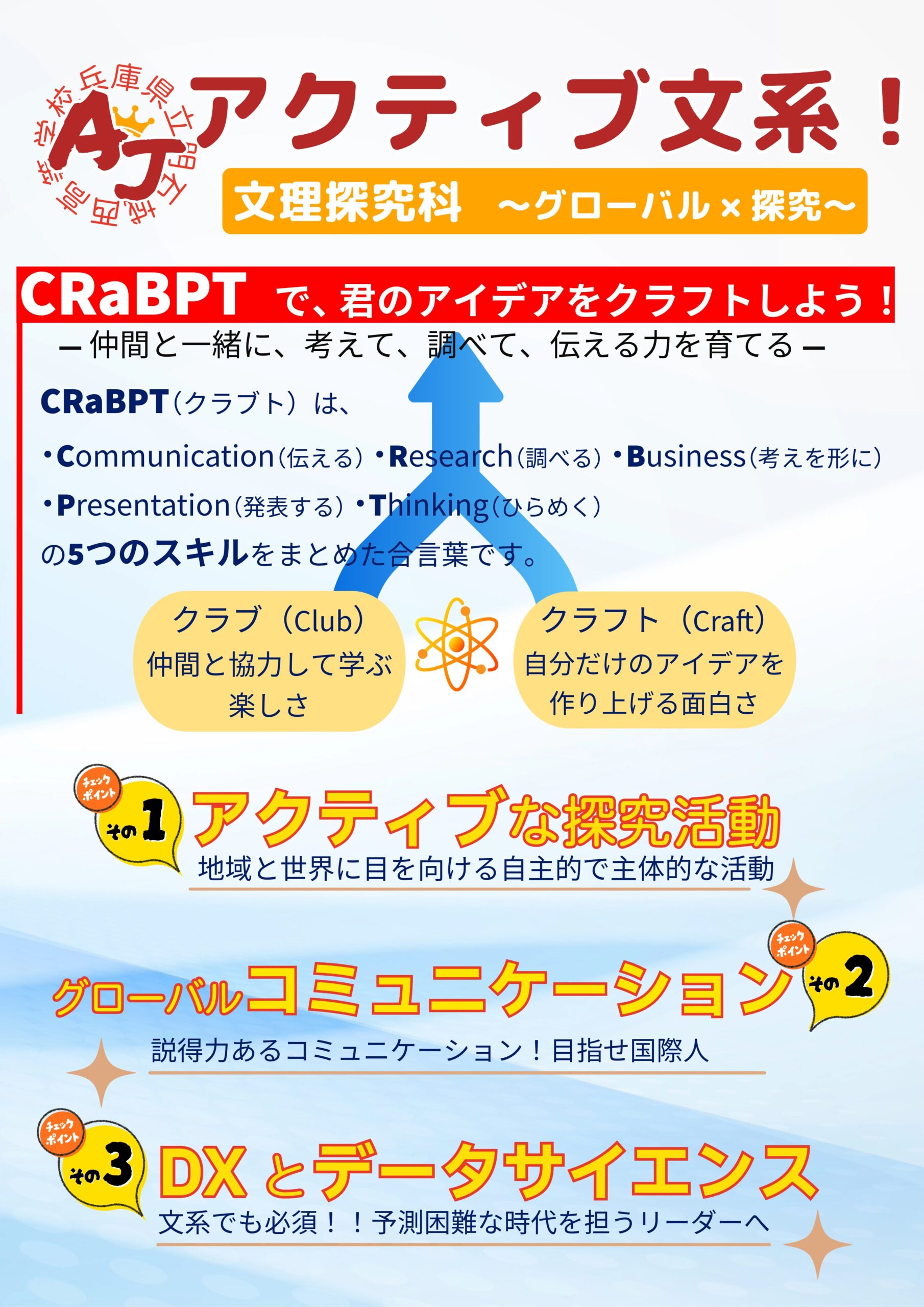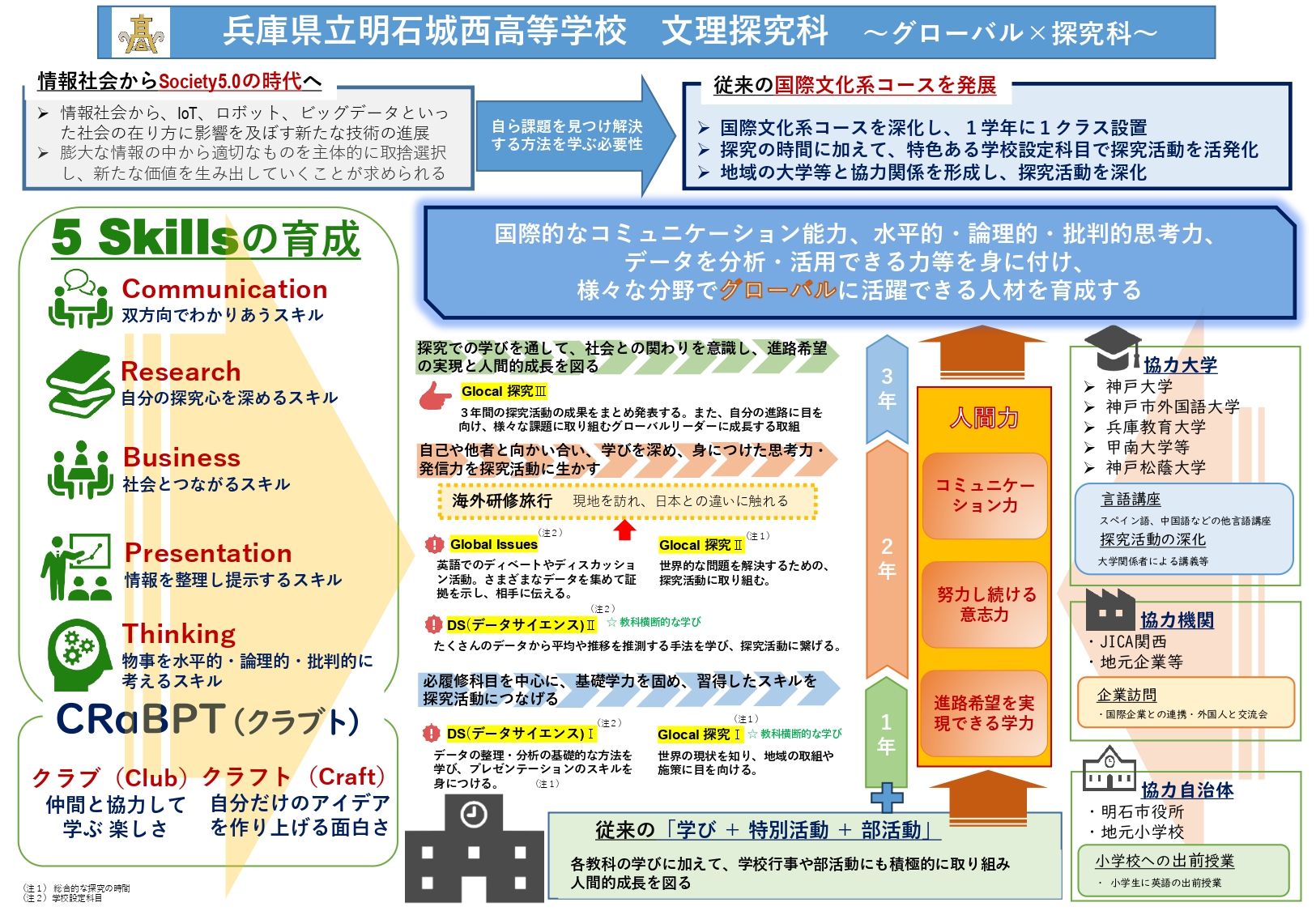 「CRaBPT(クラブト) Skills)」、グローバル社会を生き抜く国際人(グローバルリーダー)に求められる以下の5つのスキルと定義する。クラブトとは,「Clab(クラブ):仲間とともに活動する。」「Craft(クラフト):自分のアイデアを形にする。」を掛け合わせた造語です。