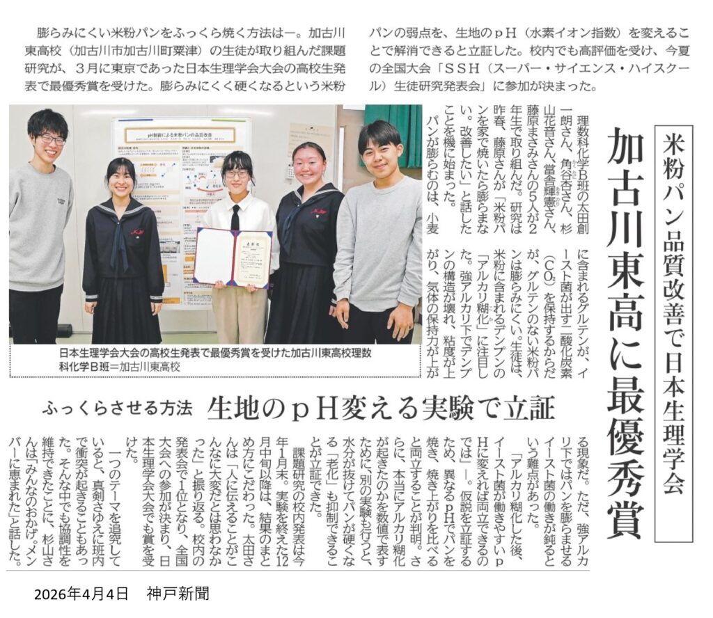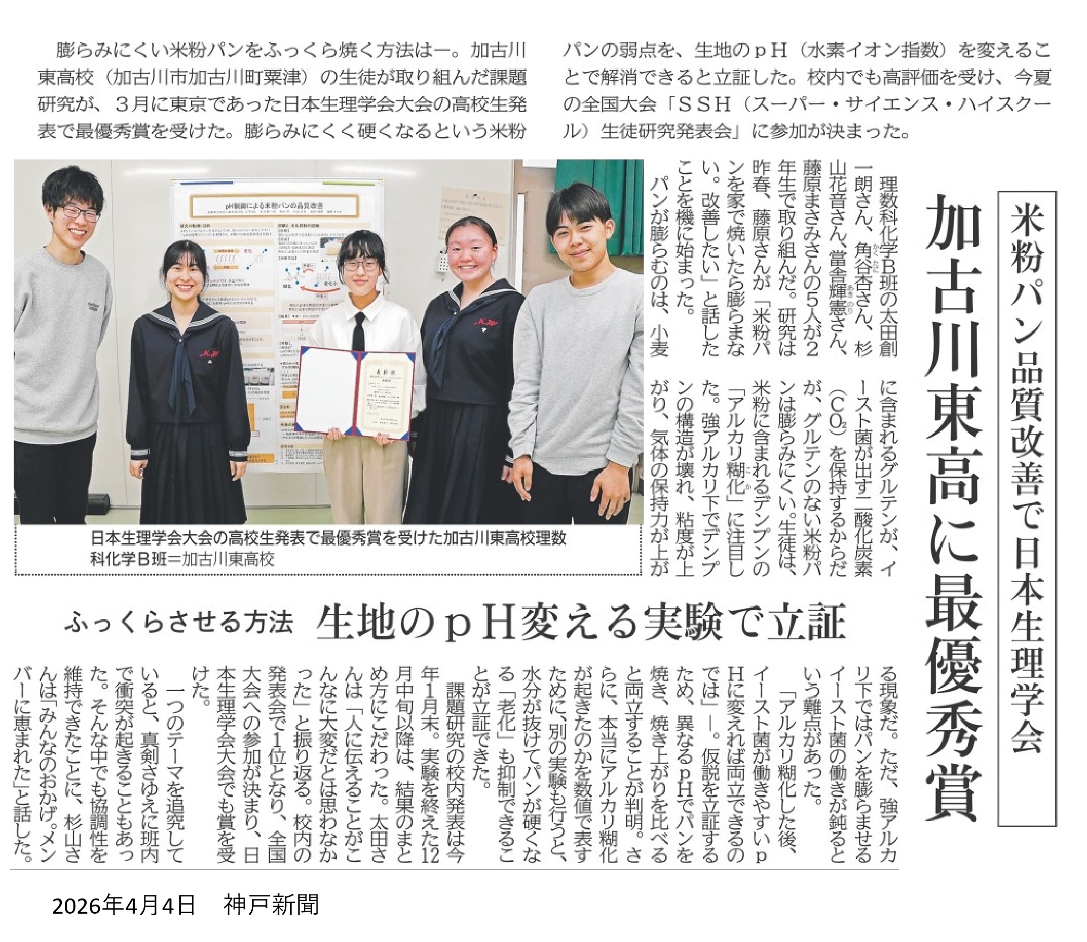 神戸新聞3月7日掲載「加古川東高生が研究発表」