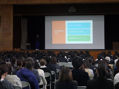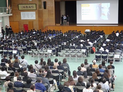 第1部の体育館での全大会では、生徒会からの学校紹介やSTEAM特別講座を体験した生徒のプレゼン、また理数科1・2年生による理数科の紹介が行われました。