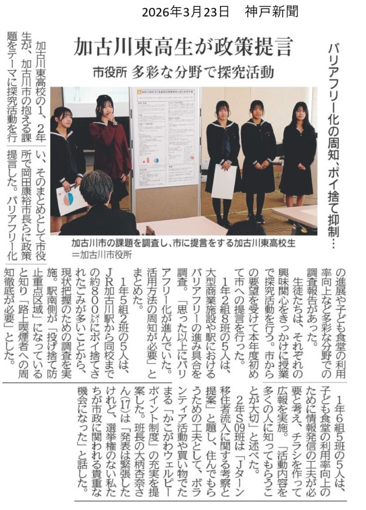 神戸新聞3月23日掲載「加古川東高生が政策提言」