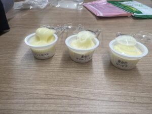 続いて行われた試食では、デンプンの有無や使用量の違いによって、同じ食品でも味や食感がどのように変化するのかを実際に体感しました。今回は、みたらしとチーズソースをそれぞれ三種類ずつ食べ比べました。口当たりのなめらかさや歯ごたえの違いは想像以上で、普段何気なく口にしている食品の裏側に、緻密な設計と工夫があることを実感しました。知識として学ぶだけでなく、五感を通して理解できた点がとても印象に残りました。