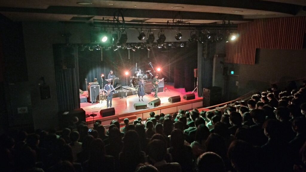 12月20日土曜日、神戸電子専門学校で行われた2025軽音連兵庫新人戦ライブにフォークソング部の1年生バンド「メルトレコード」が参加しました。熱気にあふれる満員の会場の中、バランスの取れたいいサウンドを聴かせてくれました。