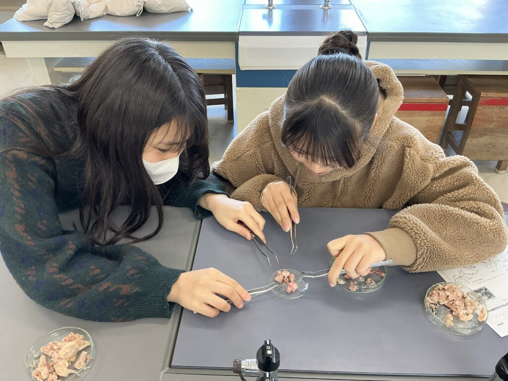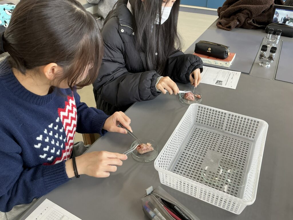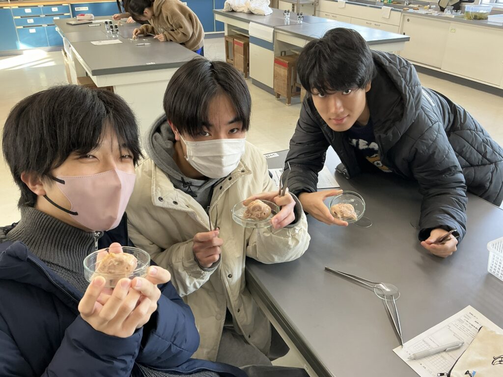 1月の3年理系、文系の生物の最後の授業で、ペットフードとして販売されているニワトリの頭を使って、鳥類の脳の観察を行いました。共通テスト後の疲れも見せず、それぞれのクラスで楽しく観察できました。これからも勉強だけでなく、”実物を観察すること”の大切さを胸に、それぞれの進学先で頑張ってほしいです。