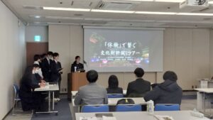 発表のタイトルは「体験で繋ぐ文化財肝試しツアー」で、GLiS類型の紹介、伊丹市の文化財保護の現状、伊丹市文化財ボランティアの会との連携とイベントの企画、そして来年度の展望について80回GLiS生6名がプレゼンを行いました。