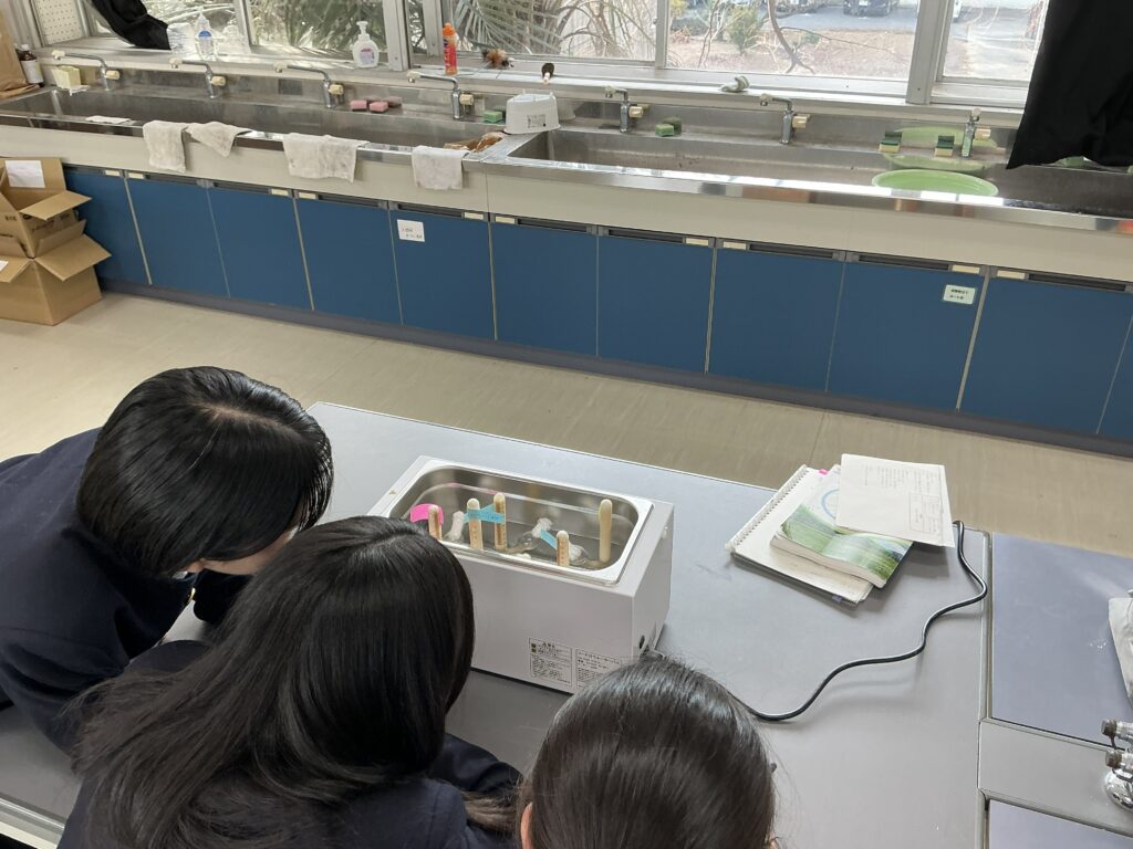 2年生物の授業で定番のアルコール発酵の実験を行いました。ホームベーカリーに使うドライイースト(酵母菌)を実験に使い、生物文系クラスでは塩、クエン酸、重曹、かたくり粉を加えたときの発酵の程度を分担して測定し、比較しました。生物理系クラスでは、各班で実験条件を考え、各班で用意した準備物(ヤクルト、麦茶、レモン果汁、チョコソース、岩塩)と何も加えない条件で対照実験を行い、発酵の程度を測定し、結果を考察しました。各クラスとも協力して実験できましたが、結果の考察には苦労している様子でした。