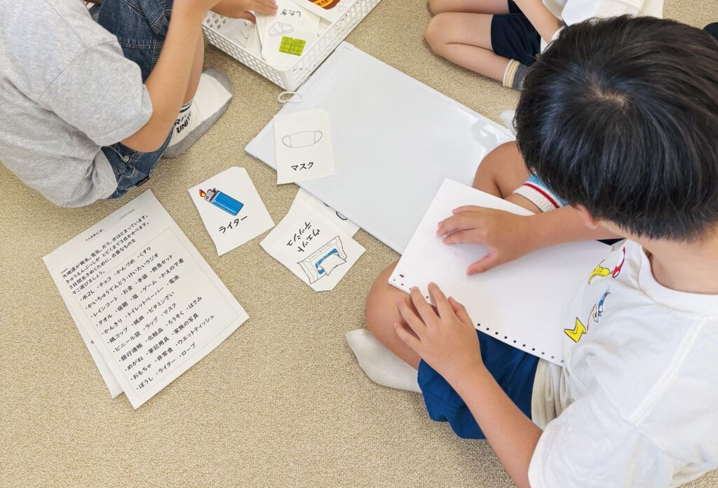 グループに分かれて、『防災リュック』を作り、災害が起きたときに必要なものを、相談しました。