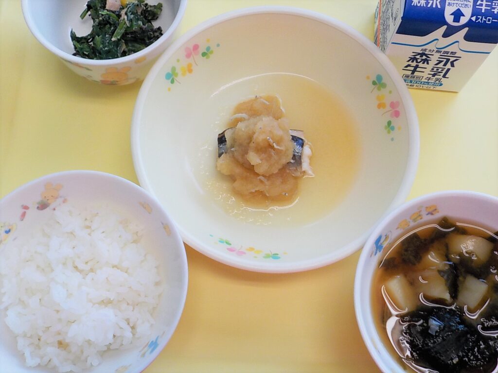 ごはん さんまのおろし煮 ほうれん草とひじきの和え物 みそ汁 牛乳