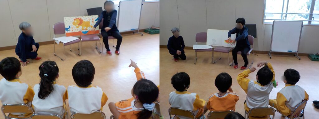 大型絵本も読んでもらい、場面ごとに子どもたちは様々な反応をして楽しそうに聞いていました。