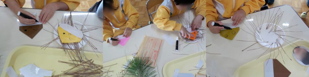 折り紙で栗を折って、松葉を使って栗のいがを作って・・・