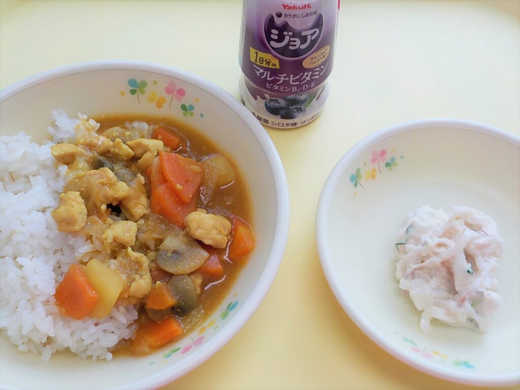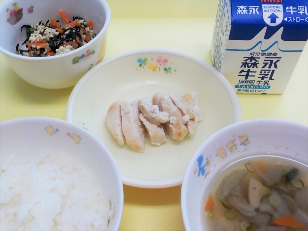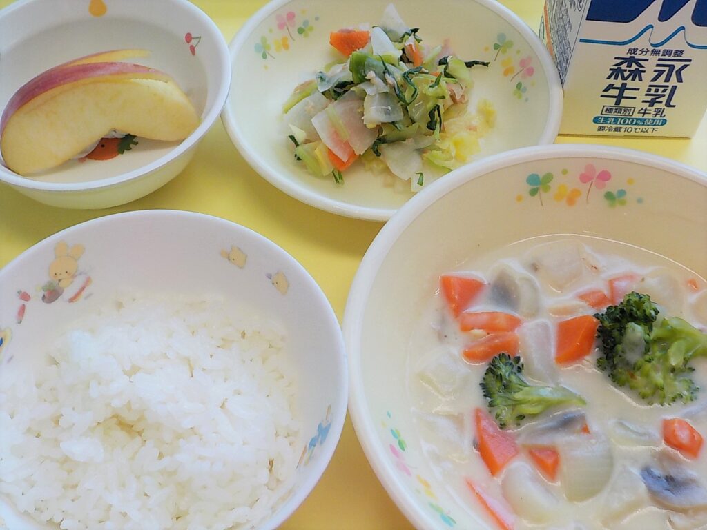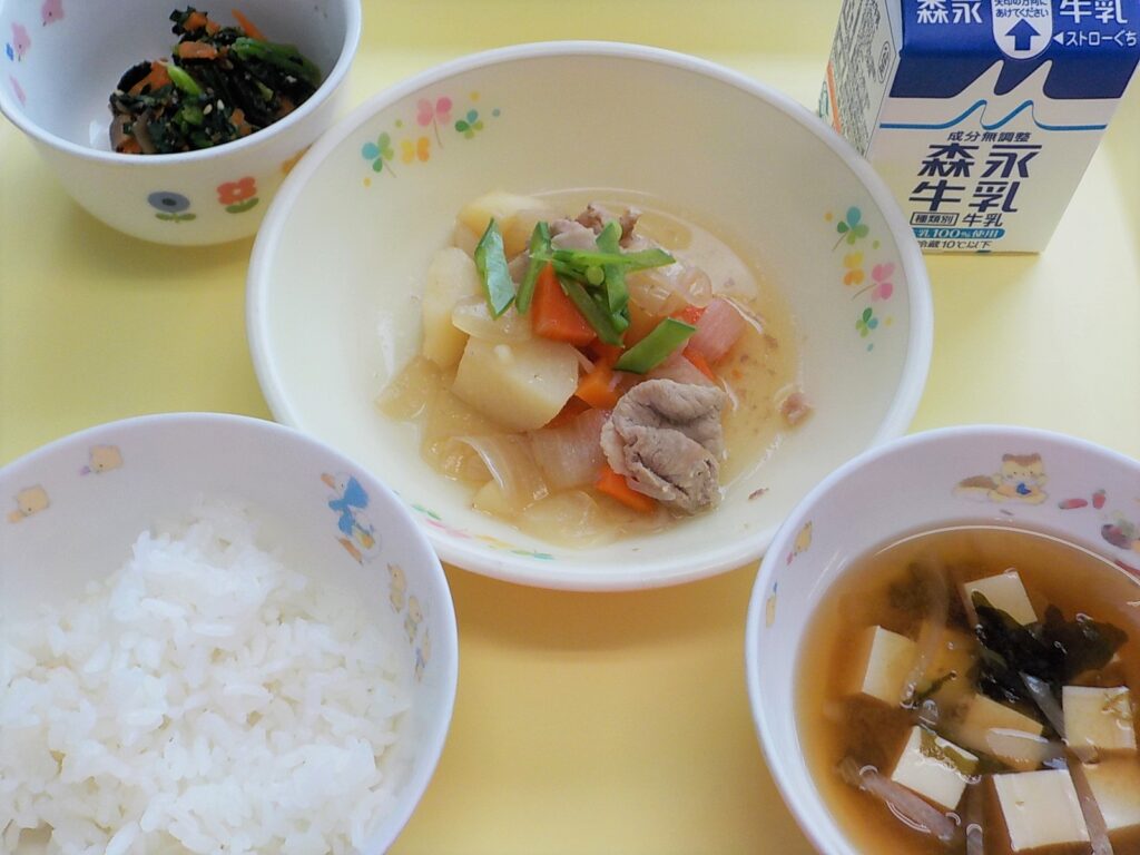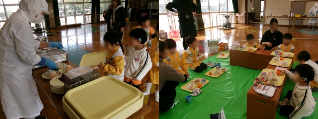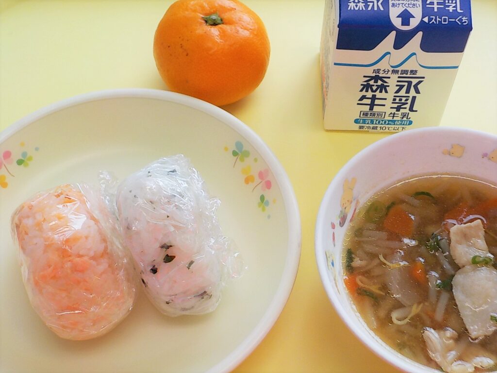 この日の給食はプレイルームで炊き出し給食でした。おにぎりに豚汁、みかんを食べました。