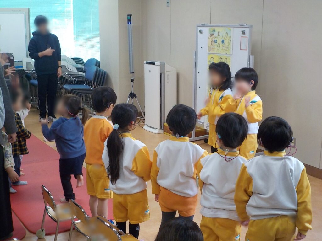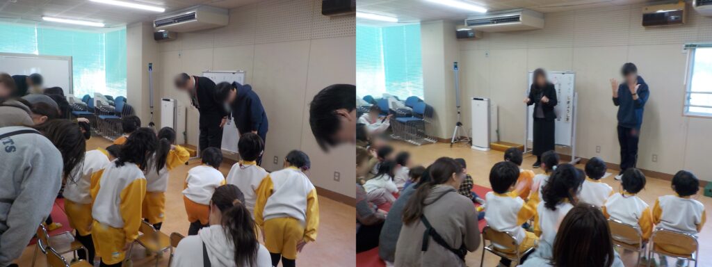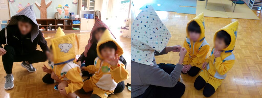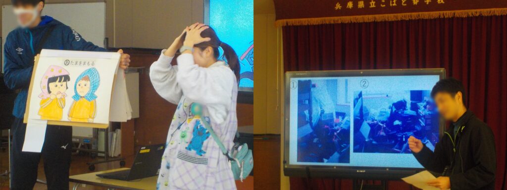 避難完了後、プレイルームに移動し、避難時の約束の確認や、実際に被災された先生のお話を聞きました。