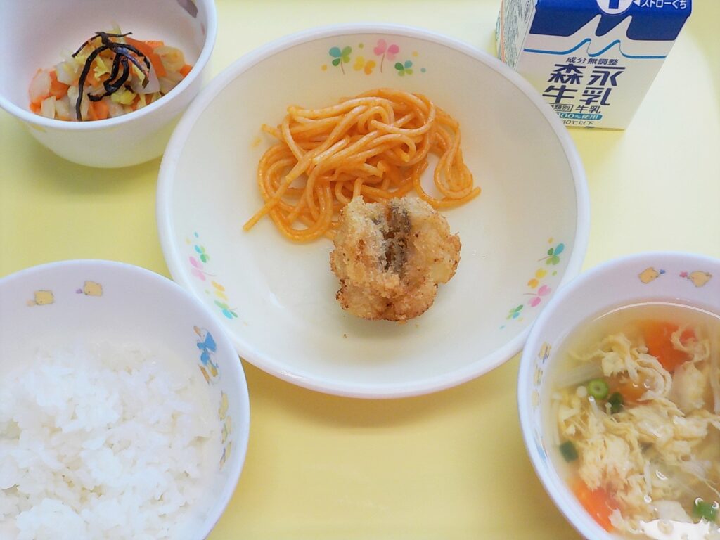 ごはん ホキフライ スパゲティソテー 白菜の塩昆布あえ かきたま汁 牛乳