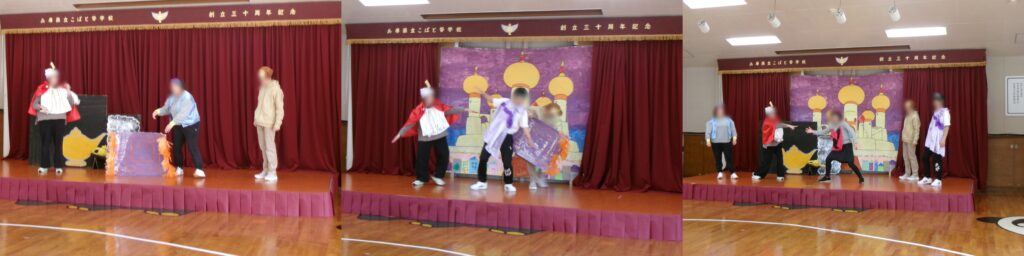 先生たちからも劇の出し物が!きく組さんが生活発表会で演じた「アラジン」を少しおもしろおかしくアレンジして、子どもたちは大喜びでした。