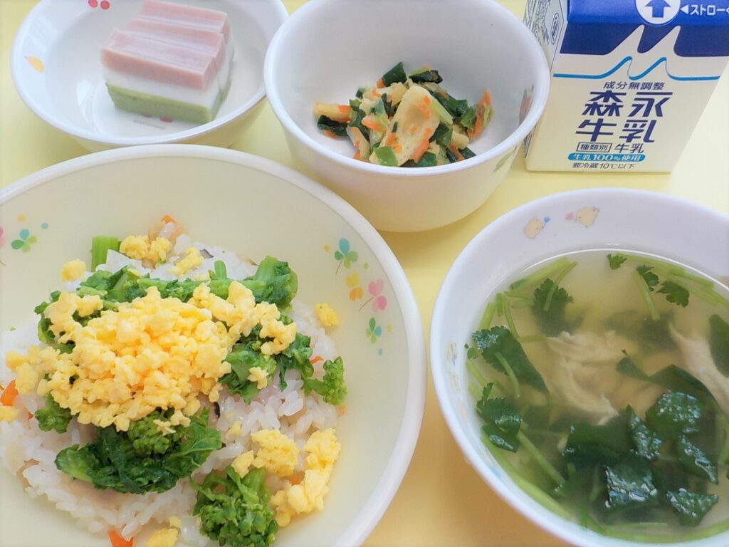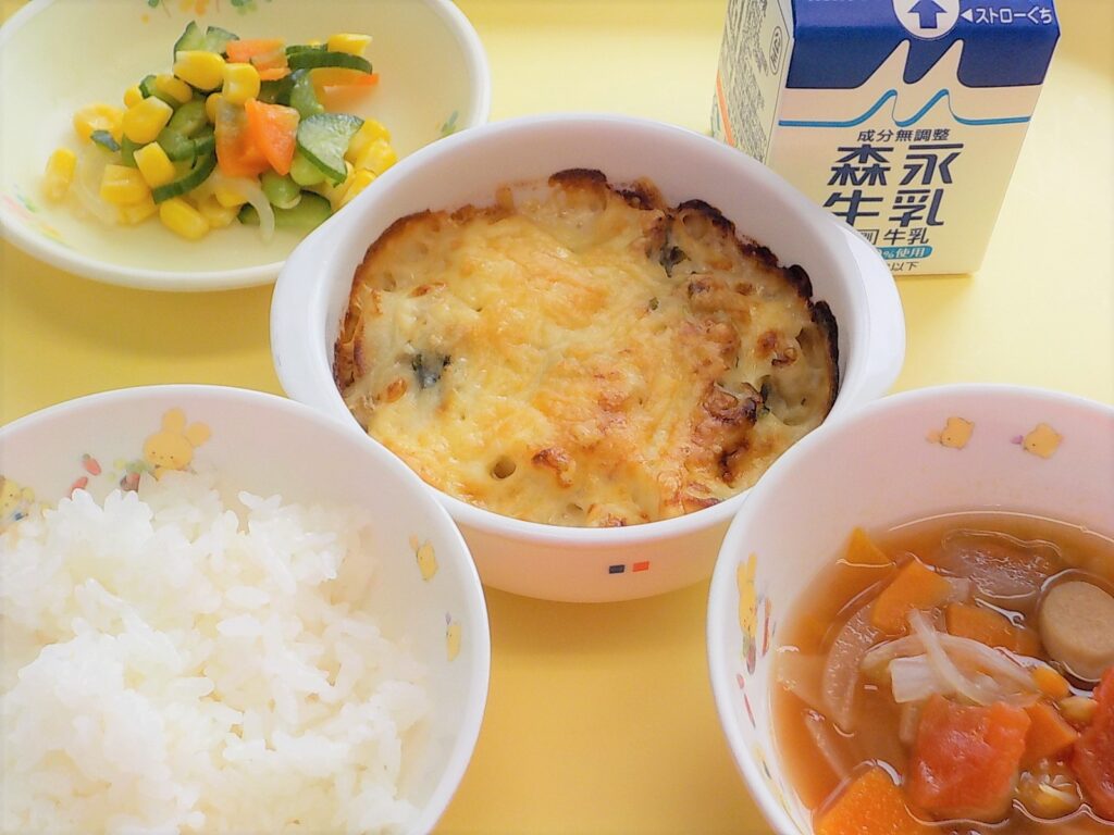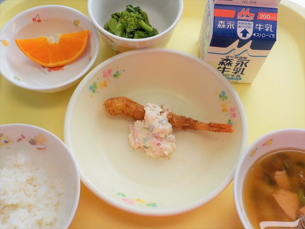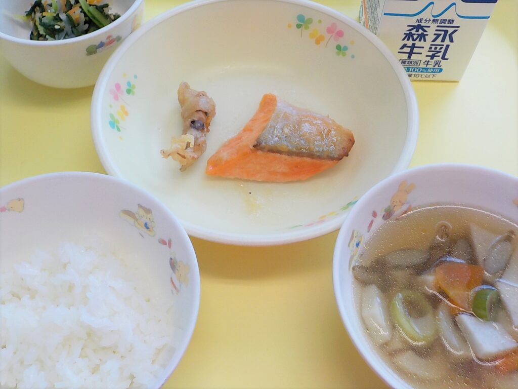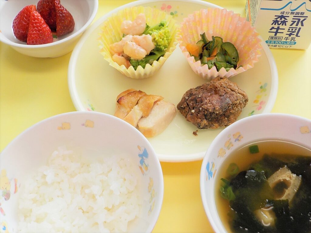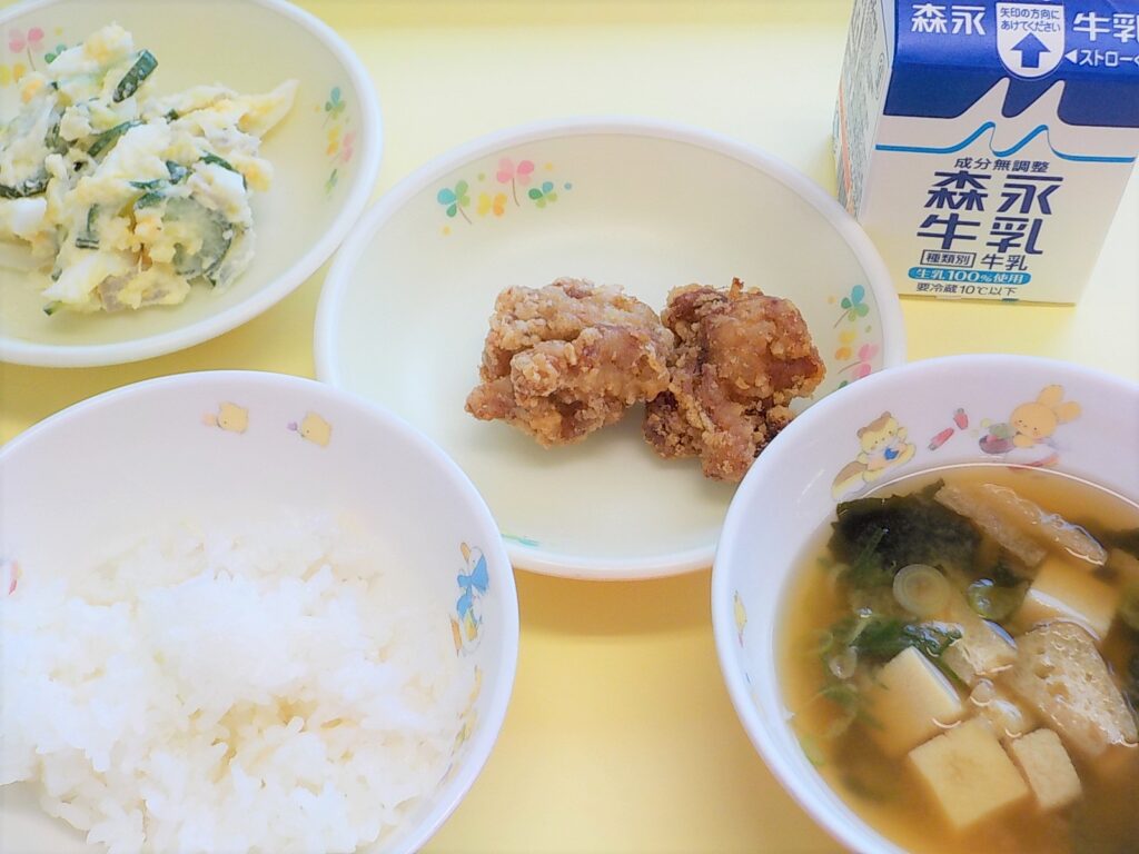 ごはん 鶏のからあげ ポテトサラダ みそ汁 牛乳