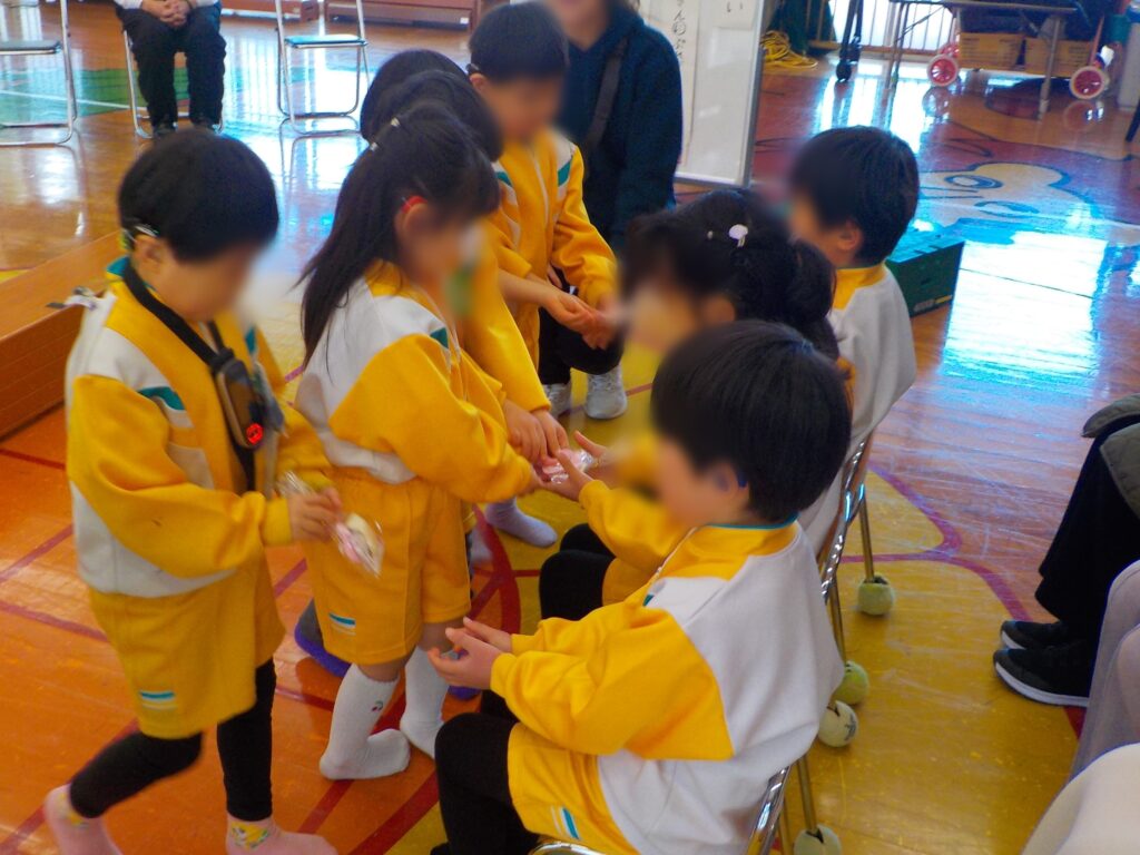 ばら組・ゆり組の子たちから、卒業するきく組さんへプレゼントを渡しました。