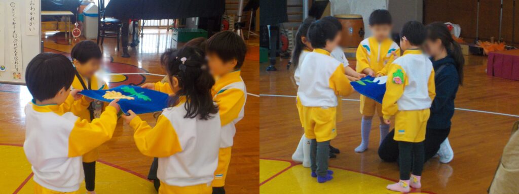 最後にきく組さんからゆり組さんへ、ゆり組さんからばら組さんへクラスの旗を渡して、「次の学年頑張ってね!」とエールが送られました。