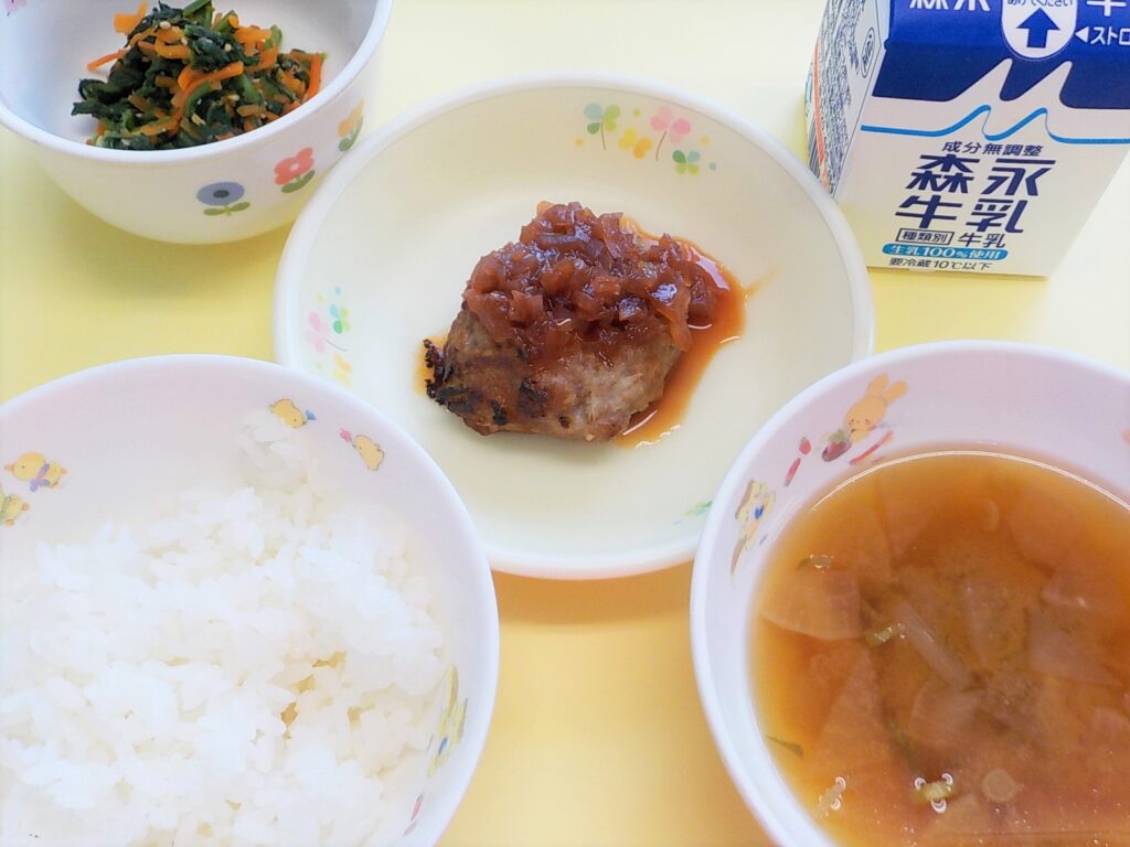 ごはん ハンバーグ ほうれん草のごまあえ みそ汁 牛乳