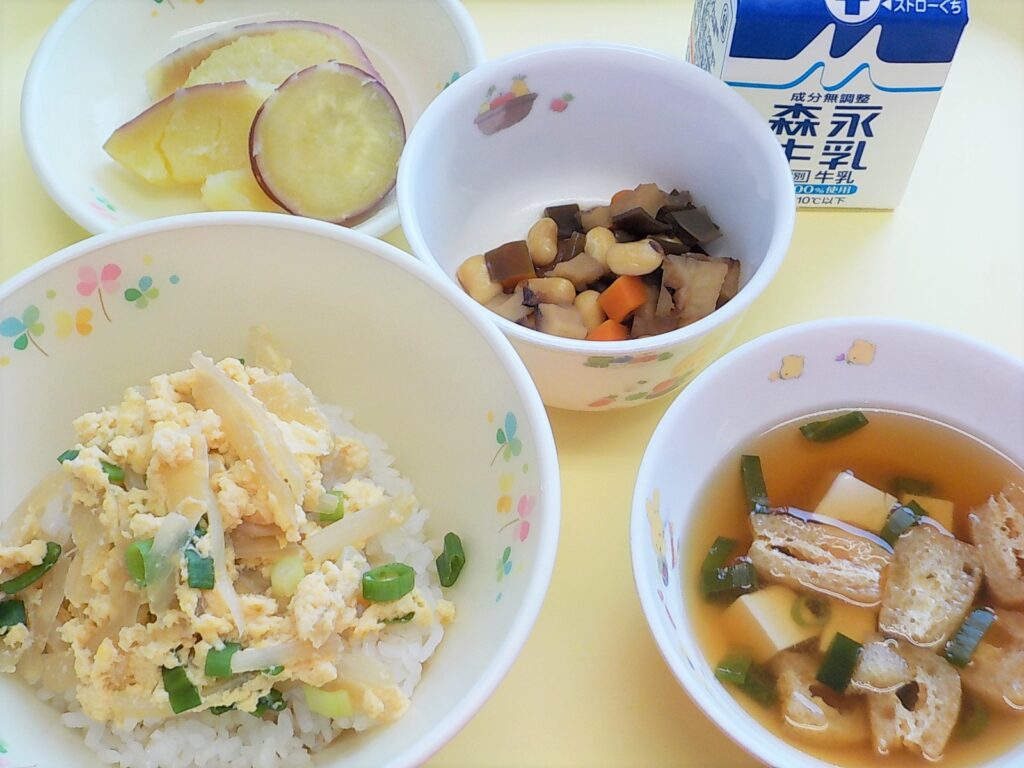 卵どんぶり 五目豆 さつまいのレモン煮 みそ汁 牛乳