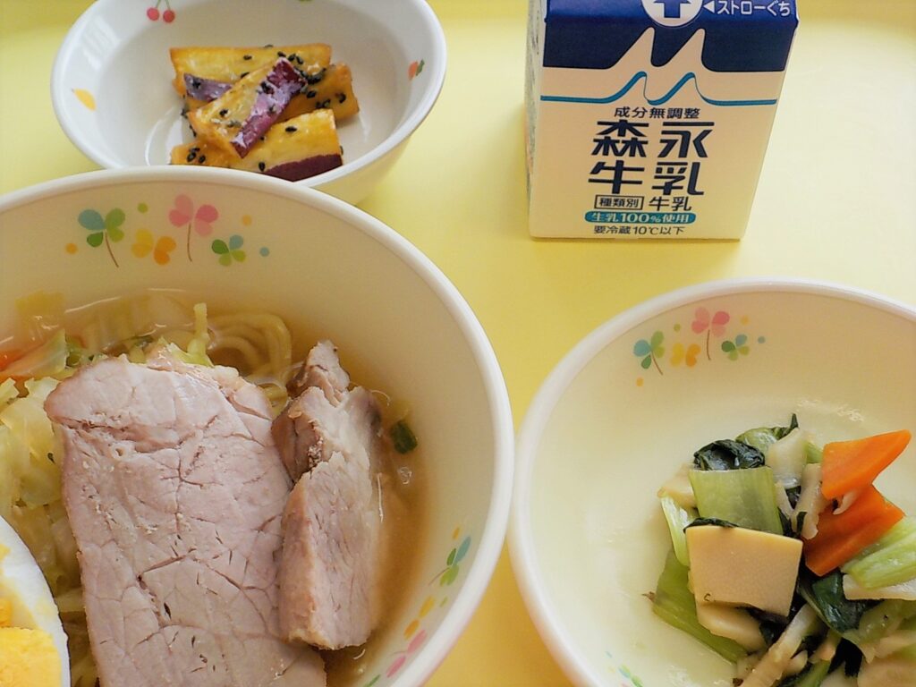 みそラーメン 青梗菜のオイスター炒め 牛乳 大学芋