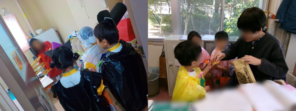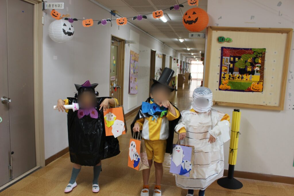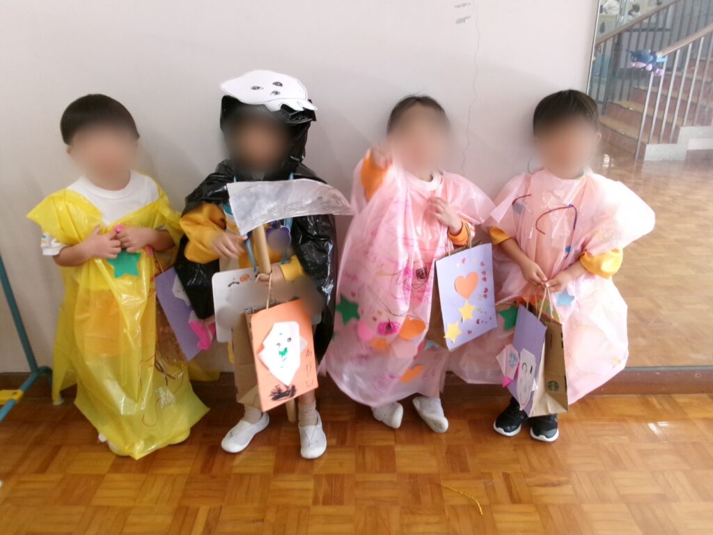 ハロウィンで着る衣装をを各クラスで製作し、仮装していろいろな先生をたずねて回りました。合言葉は「トリックオアトリート!お菓子をくれなきゃいたずらするぞ!!」