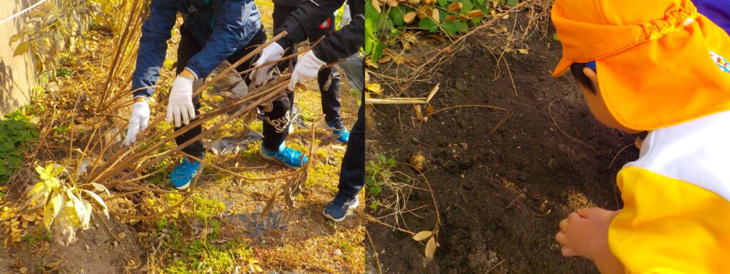 高く伸びた菊芋の茎が枯れてきて菊芋の掘り時になったので、幼稚部のなかよし遊びの時間にみんなで畑に掘りに行きました。