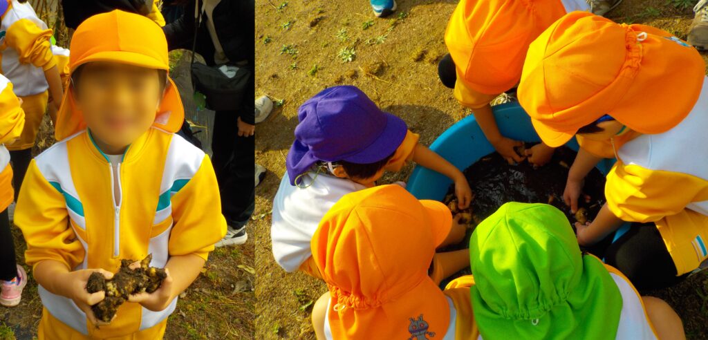 「大きいのがとれたよ!」 「みんなで洗って泥を落とそう!」ゴシゴシゴシ
