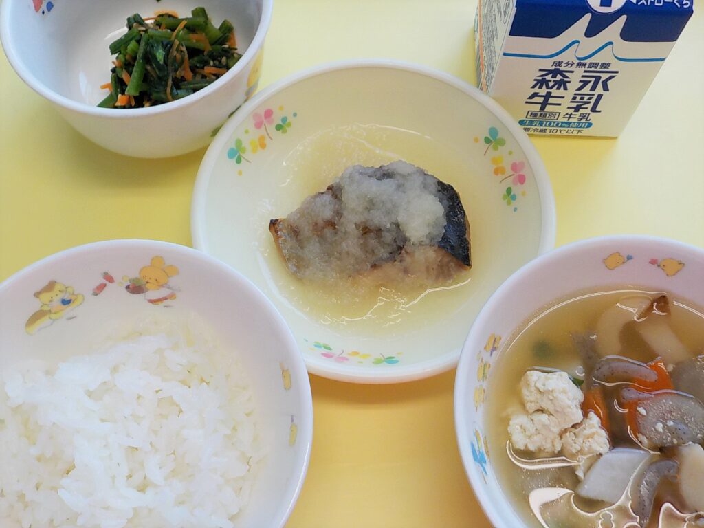 ごはん              あじのおろし煮          ほうれん草のごまあえ       みそ汁              牛乳