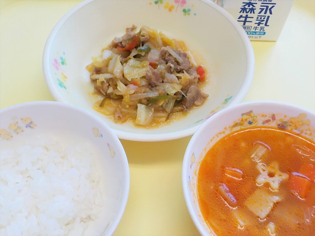 ごはん 肉と野菜の炒め物 ミネストローネ 牛乳
