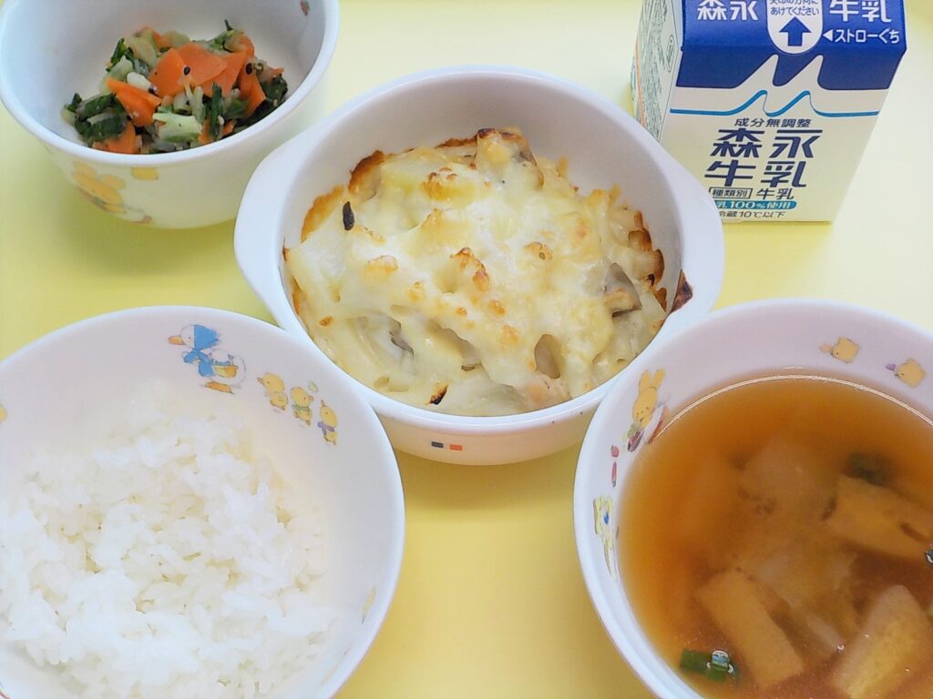 ごはん マカロニグラタン しろなのごまあえ みそ汁 牛乳