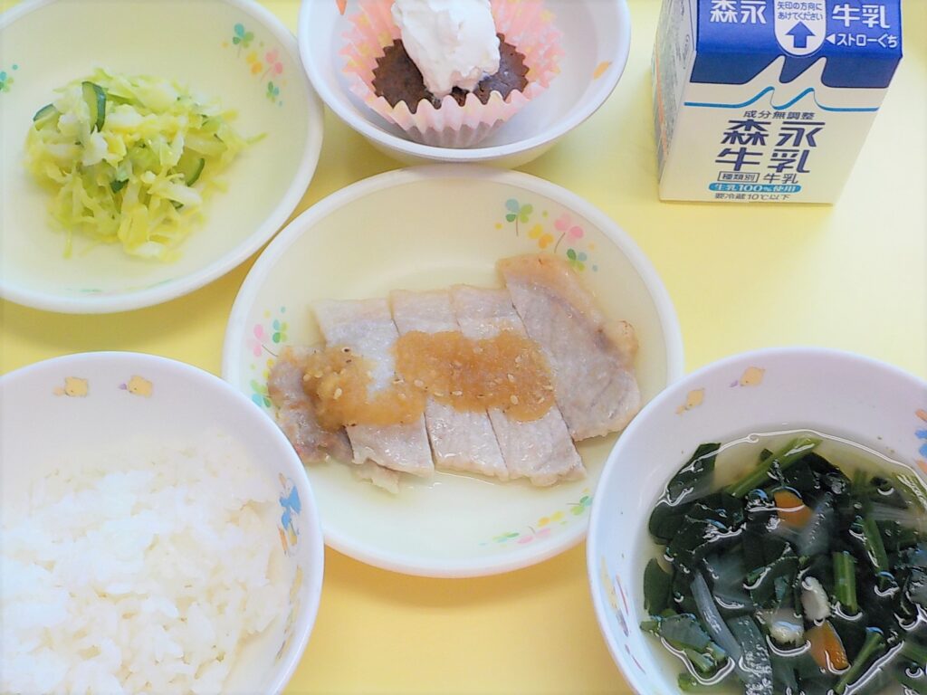ごはん 豚肉のりんごソースかけ キャベツのサラダ ほうれん草のスープ 牛乳 チョコレートケーキ
