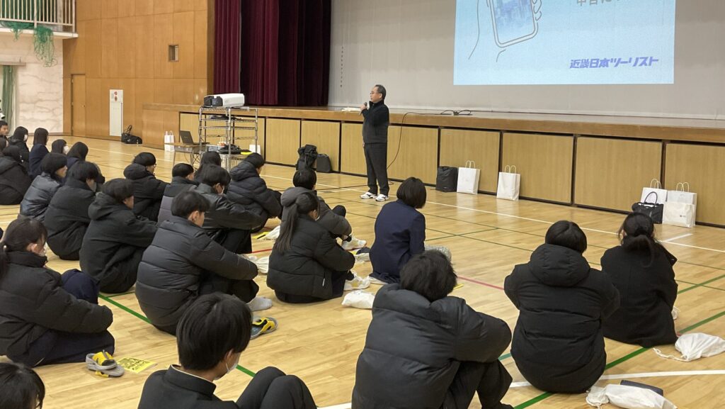 12月23日(火)1限 体育館にて、近畿日本ツーリストの方に来ていただき、修学旅行に向けた学年集会を実施しました。3泊4日の行程、飛行機における搭乗方法や荷物の注意事項にいて説明を受けました。初めて海…