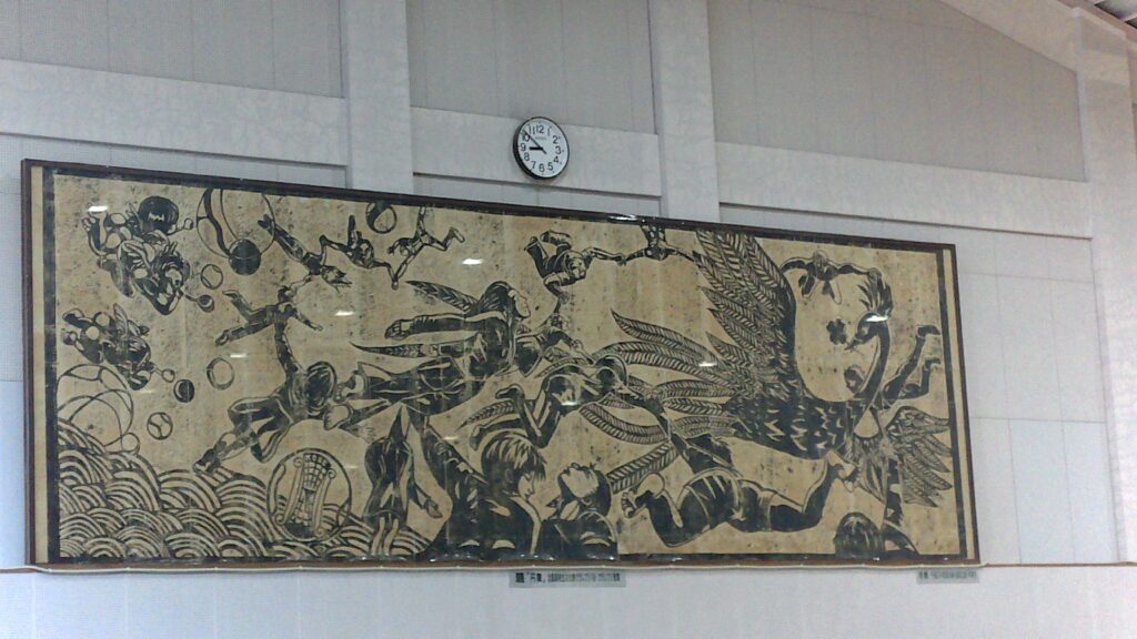 12月24日(水)2学期終業式が行われました。校長先生のお話の中で、体育館に飾られている巨大版画についての説明がありました。この版画は、縦4メートル、横12メートルという大きさで、約30年前に「震災復興」をテーマとして、当時の県商生が制作したものです。不死鳥と復興に向かって飛躍する人々の姿が力強く表現されています。体育館に入るたびに目にしてきた巨大版画ですが、制作の過程や当時のエピソードを知ることで、これまで以上に温かみを感じることができました。校長先生からは、「私たちが目にしているものは一部にすぎず、さまざまな情報を得ることで物事の本質が見えてくる」というお話もありました。いつも見慣れている巨大版画から、多くのことを感じ、考えるきっかけとなった終業式となりました。