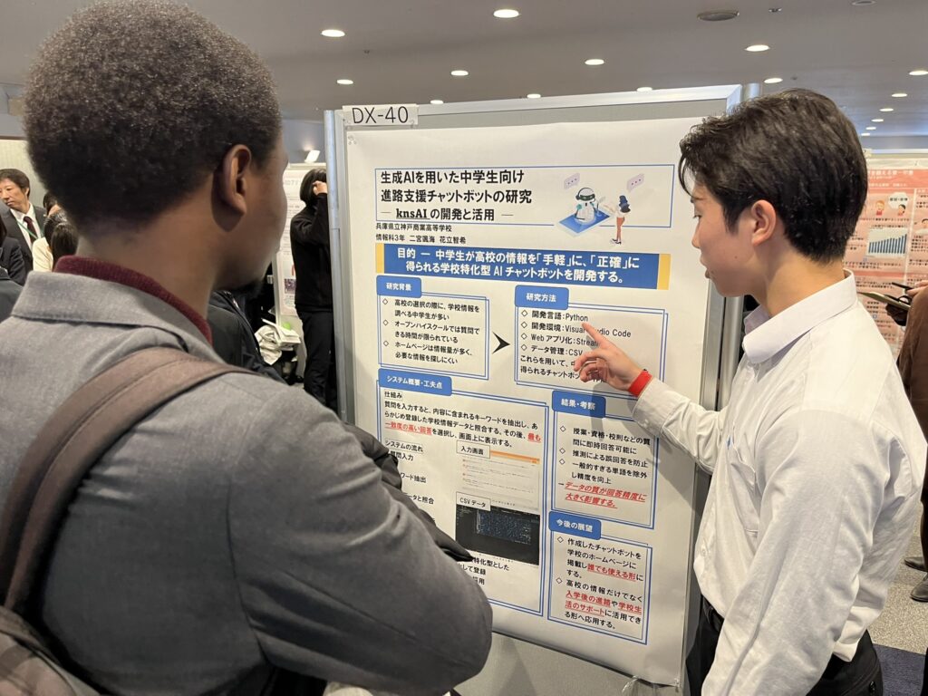 ポスター発表では、DXハイスクールのカテゴリーに3年情報科の生徒2名と2年情報科1名の計2グループが、探究活動のカテゴリーにおいて2年商業科の生徒6名の1グループが参加し、これまで学んできた成果をたくさんの人に披露しました。