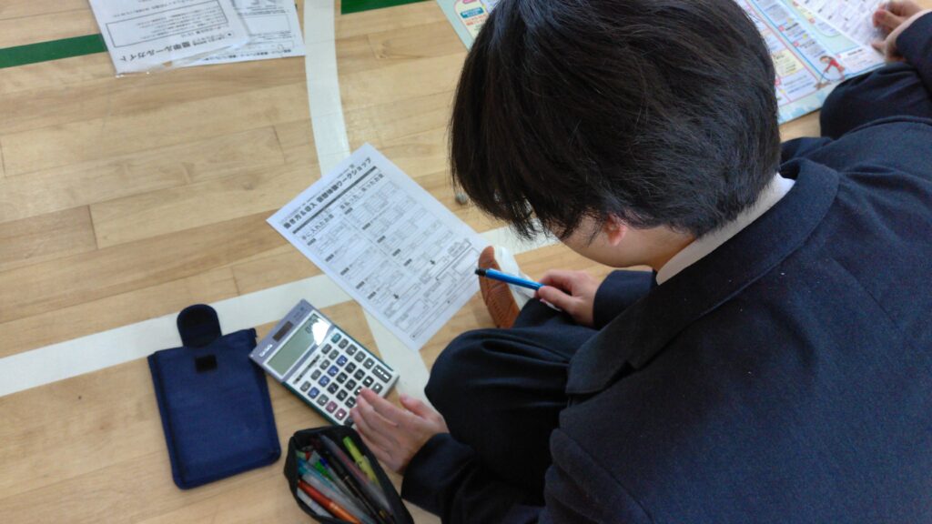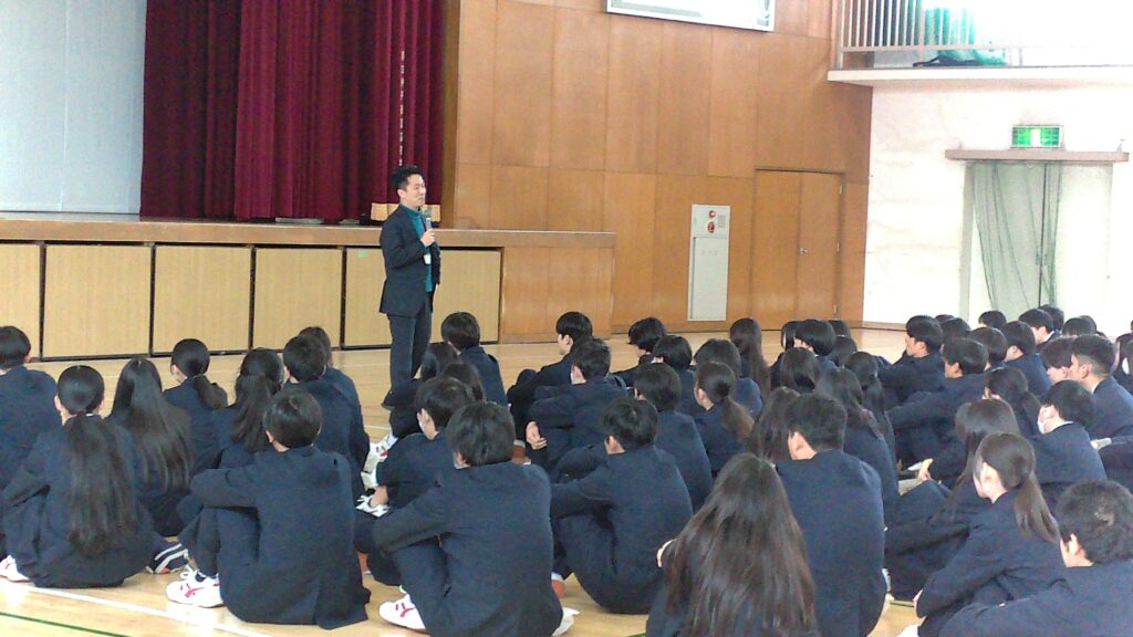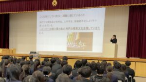 3月18日(水)、1年生を対象に『今日からできる!夢の可能性100%の法則』というテーマで講師の竹下しんいち様をお招きし、講演会を実施しました。講演会後には、すごろく形式のワークで働き方と収入の仮想体験ワークをおこない、将来の生活にかかるコストと収入を疑似体験しました。また、マンダラートを用いて、自己理解を深め今やるべきことと将来の展望をつなげ、高校生活や進路活動へのモチベーションを高めることができました。
