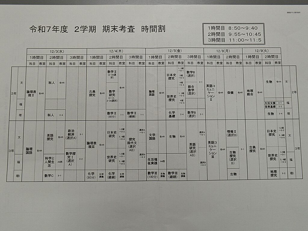 2025年12月2日 / 最終更新日時 : 2025年12月2日 神戸 北子 学校生活 北高生活 276 期末考査始まる 明日(12月3日)から期末考査が始まります。今夜から気温も下がり、寒さが増すようです。体調を整え、万全な状態で考査に臨みましょう。