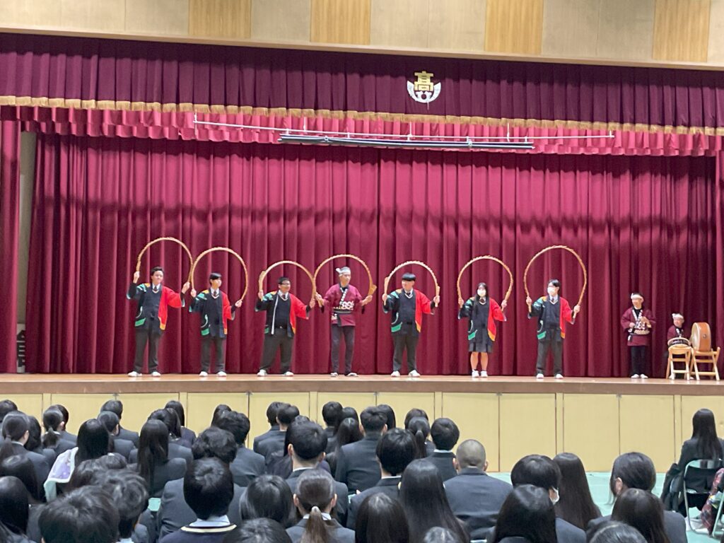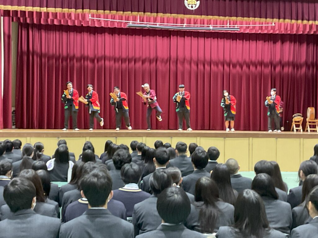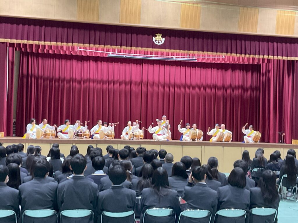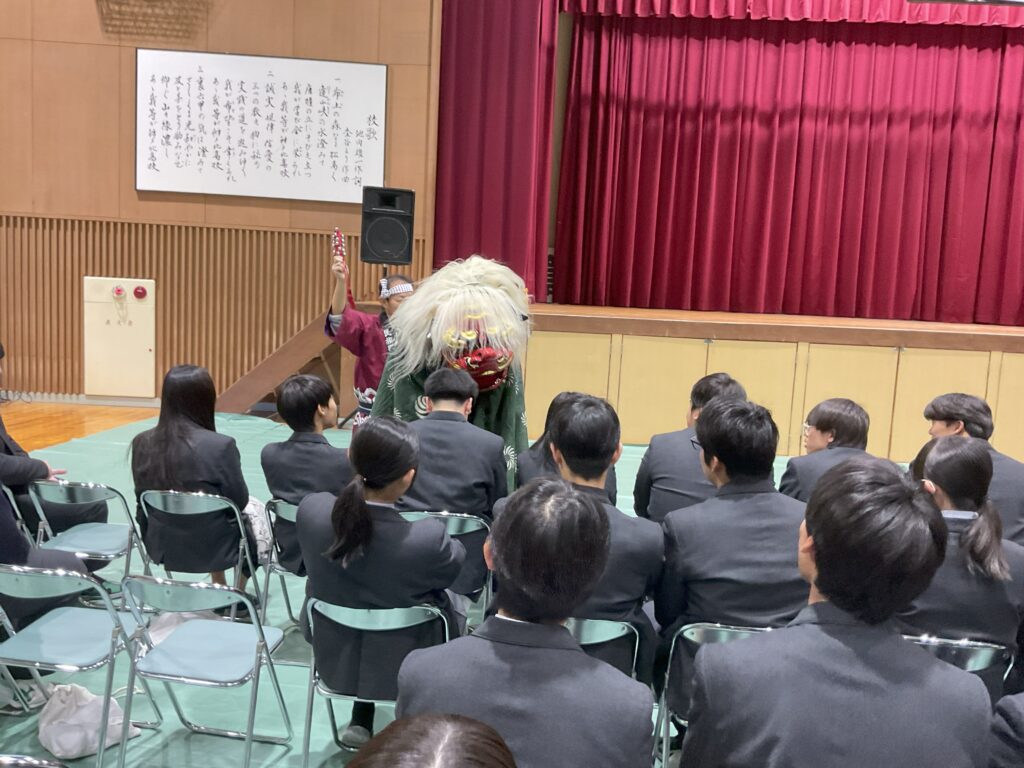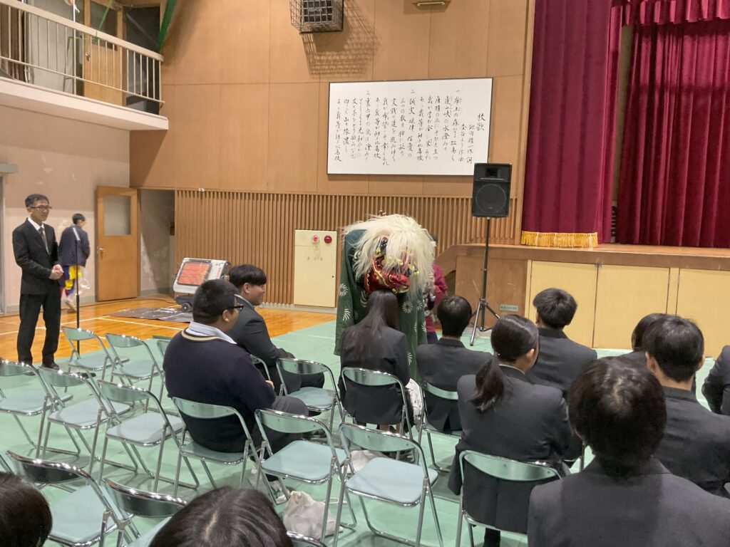 谷茶前(人形劇)、南京玉すだれ(生徒参加)、こきりこ節(民謡演奏)、親子獅子(厄払い)、サムルノリ(韓国現代音楽)の演目を披露していただきました。