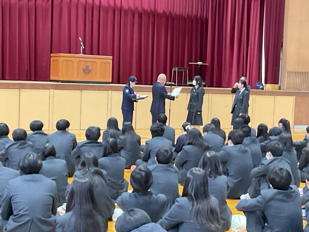 感謝状贈呈式の後、防犯協会と警察署職員の方から高校生が冬季休業中に犯罪や事故に巻き込まれないよう、アドバイスをいただきました。