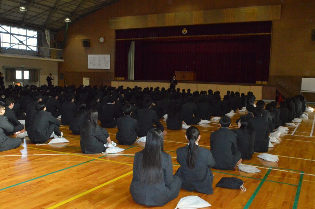 本日、3学期の始業式を行いました。校長先生から、校訓「誠実」、「規律」、「信愛」、「実践」について説明があり、校訓を胸に刻んで過ごすようお話がありました。また、生徒指導部長から、式典での正装及び校歌斉唱の重要さ等について、お話がありました。