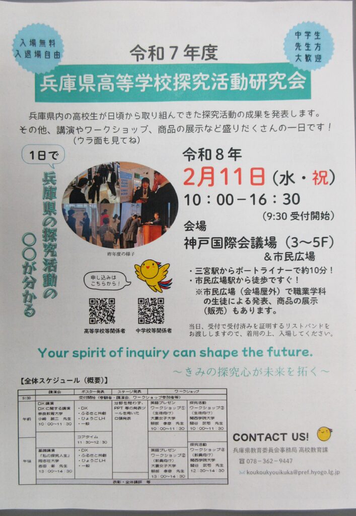 2026年2月10日 / 最終更新日時 : 2026年2月10日 神戸 北子 未分類 北高生活 296 兵庫県高等学校探究活動研究会が開催されます。 明日、神戸国際会議場及び市民広場で兵庫県高等学校探究活動研究会が開催され、県内の高校生が取り組んできた探究活動の成果の発表等が行われます。 本校生徒も2グループ出場します。