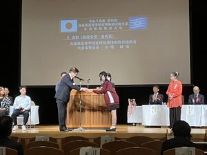 本校からは、9月の阪丹地区大会で代表に選ばれた1部の山本さん、3部の濱口さんが登壇しました。それぞれが地区大会の原稿を推敲し、スピーチに磨きをかけて臨みました。審査の結果、本校1部山本さんが最優秀賞、3部濱口さんが優秀賞に選ばれ、11月に開催される全国大会に出場することになりました。これまでの努力が実を結び、嬉しい限りです。次は、全国から集まる参加者や聴衆に感動を伝えてください。