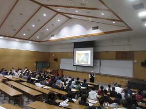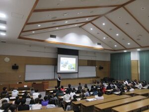本日は雨天のため、御前浜での清掃活動が中止となりましたが、現地で講話いただく予定だった浜・川・山のしぜん探検隊の先生が本校でお話をしてくださいました。香風高校がある浜脇地区には美しい自然があり、生息している生き物がたくさんいます。講師の先生は、疲れた時に自然にいやされた経験を話され、地域の自然を保護していくことの大切さを伝えられました。自然は美しさだけでなく怖さもあります、防災活動などについても話され、自然と共生することの大切さも教えていただきました。学校の活動は、地域の方々に支えられています。高校生が今できる取組を通して、ふるさと共創に貢献していきたいと思います。