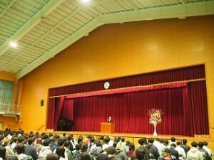 各部で後期終業式が行われました。校長先生は講話で、冬季五輪を振り返りながら、日頃の頑張りを評価してくれる人や励ましてくれる人、そして支えてくれる人が必ずいるから、香風生にはこれからも何事にも精一杯取り組んでほしい、とお話しくださいました。そして、香風生が備えている人間性、なかでも「やさしさ」がきっとまたほかの誰かの支えになり、励みになっている、ということを伝えてくださいました。この1年もたくさんの出会いがあり、勉強、部活、仕事にアルバイトに頑張ってきたことだと思います。4月からも人にやさしく、助け合える、香風高校でありますように。