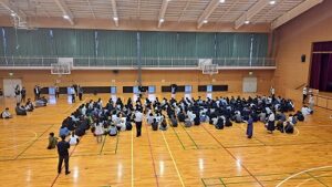 1部は2限、2部は8限、3部は12限に防災避難訓練を行いました。今回は、南海トラフ地震により大津波警報が発令されたという想定のもと、生徒自身が避難経路を確認し、行動できるようにすることを目的として実施しました。生徒は校内放送の指示に従って、体育館及び講堂へ避難しました。また、実際に本校から水平避難する場合は、建石筋を北上し、JRさくら夙川駅を越えた線路沿いを東へ進み、安井小学校まで避難するため、動画を使ってその経路を確認し、災害時の対応について理解を深めました。