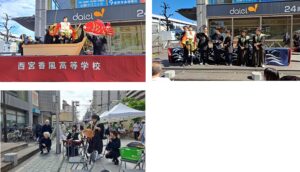 西宮中央商店街で開催された「戎参道まつり」のステージにおいて、本校VIENTの生徒5名が戎座人形芝居館の皆様とともに西宮の伝統芸能である「西宮戎舞」を演じました。