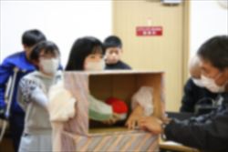 「箱の中身は、なんだろうな?」 箱の中に3つの物が入っています。横から手を入れて何が入っているか当てます。